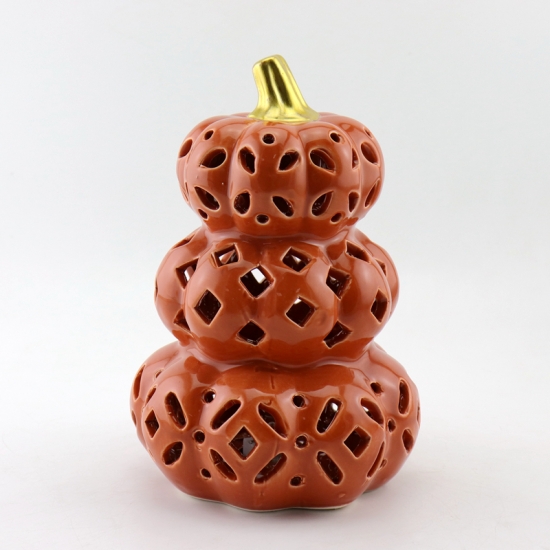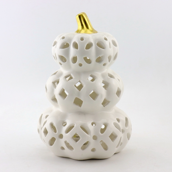 Decorate your seasonal display in delicate color using this Lovely Ceramic Pumpkin. Hand painted in a beautiful orange/white and gold, the pumpkin with its ribbed body and golden stem adds countryside charm to your home with hollow as tealight holders. Exquisite in detail and delight, this autumn accent is a wonderful addition to a mantel, countertop or Thanksgiving day arrangement.