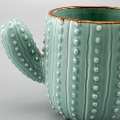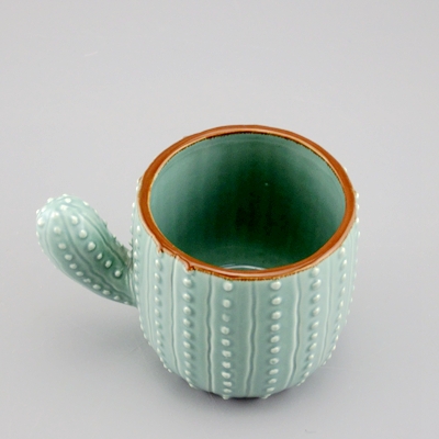 This cactus ceramic mug are made on the pottery wheel from smooth stoneware clay & glazed emerald green. The dots were are done one at a time, using a squeeze bottle filled with liquid clay. The technique is called slip-trailing.