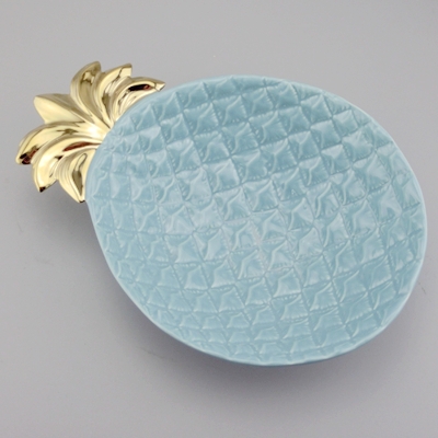 Deep Large Pineapple Ceramic Bowl Blue and Gold Leaf, is made in earthenware will blue glaze and gold leaf, large size to store food and fruits. CA65 and FDA safe, hand wash only, non-microwave safe because of gold finish.