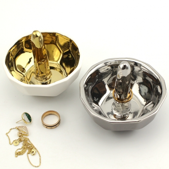 2000Made in stoneware, plating with gold and silver finish interior, glaze outside with bisque white and matt grey, our Ceramic Rind Holder Silver and Gold are with medium size, This Ring Holder is the perfect combination of flawless style and functionality. Featuring a ceramic and polished gold piece, the neutral colors have this ring holder blend in seamlessly with your other table accents. Ideal to hold your rings and store other small treasures. Available in two finishes.