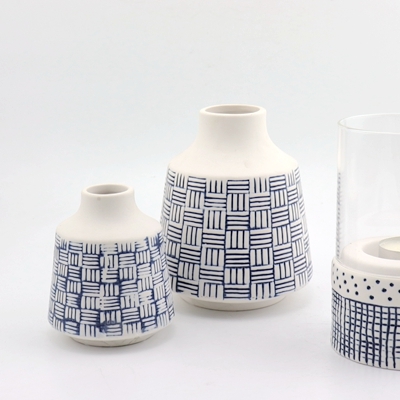 1200 pcsOur White Small Ceramic Bud Vase is perfect accessory to any home. Add these charming vases to shelves, accent tables or windowsills. Available in two sizes 5.6''H and 4''H, white color with blue stripes finish.