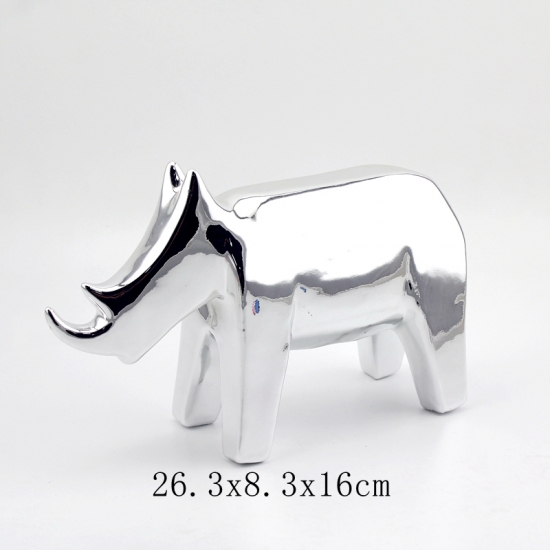 Silver ceramic rihno figurine is made in porcelain and shiny silver finish, with modern and abstract sillouette. Better be gift and deco for your home.